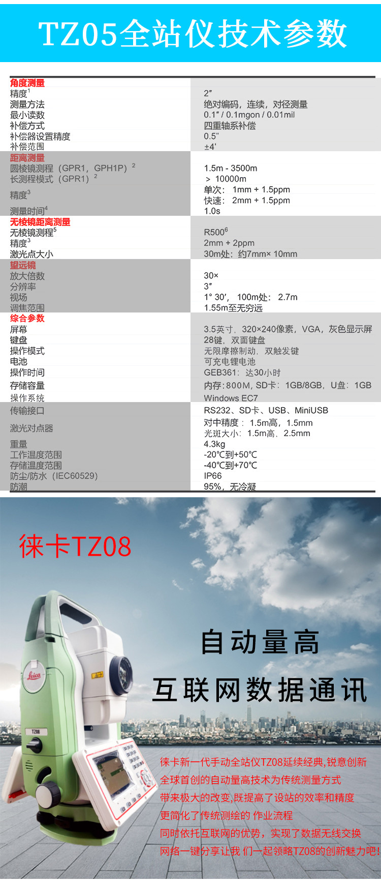 徠卡TZ08全站儀自動(dòng)量高、互聯(lián)網(wǎng)數(shù)據(jù)通訊 徠卡新一代手動(dòng)徠卡全站儀TZ08延續(xù)經(jīng)典,銳意創(chuàng)新,自動(dòng)量高技術(shù)為傳統(tǒng)測(cè)量方式帶來較大的改變,既提高了設(shè)站的效率和精度,更簡化了傳統(tǒng)測(cè)繪的作業(yè)流程。同...