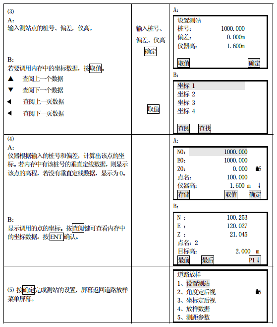 測站的設(shè)置可以通過鍵盤或從儀器內(nèi)存讀取的方式輸入。鍵盤輸入是按“樁號、偏差” 的形式輸入的,而從內(nèi)存中讀取的是 N、E、Z 坐標(biāo)形式。